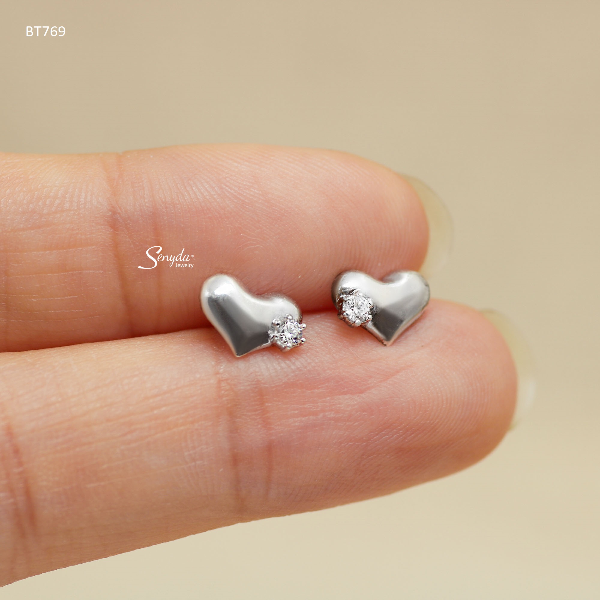 Mô tả: BT769 Bông tai bạc Ý Senyda tim trơn phồng nụ đá nhỏ