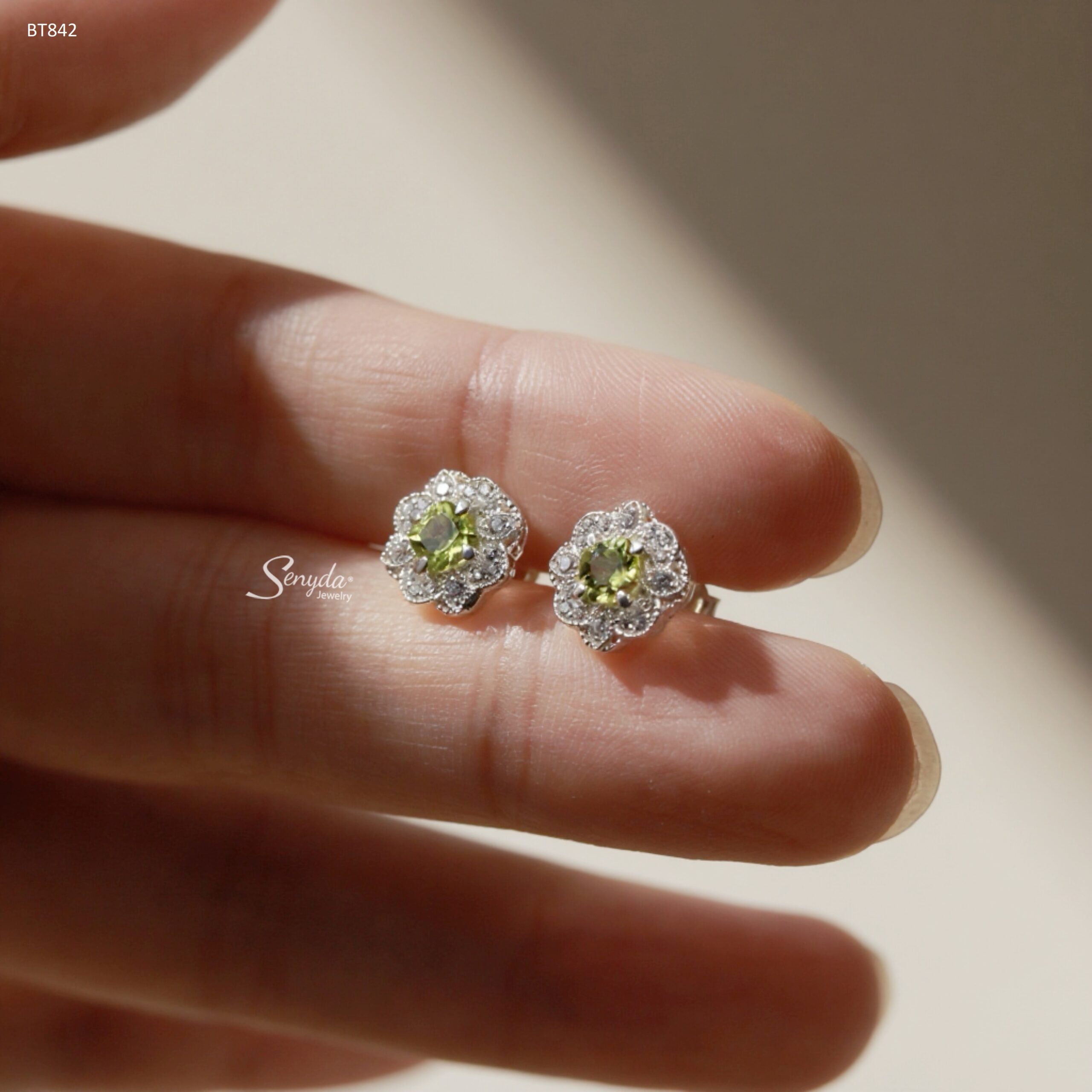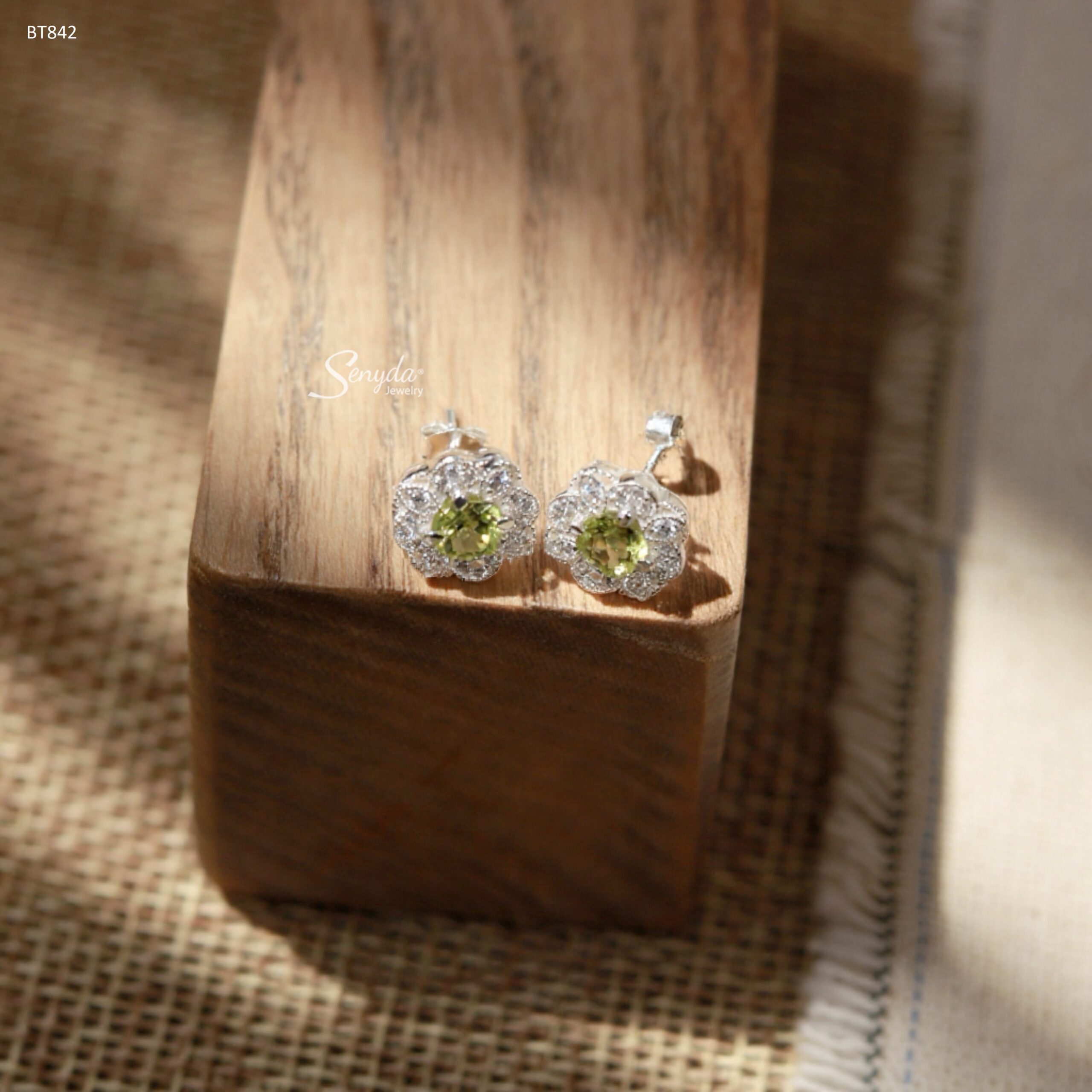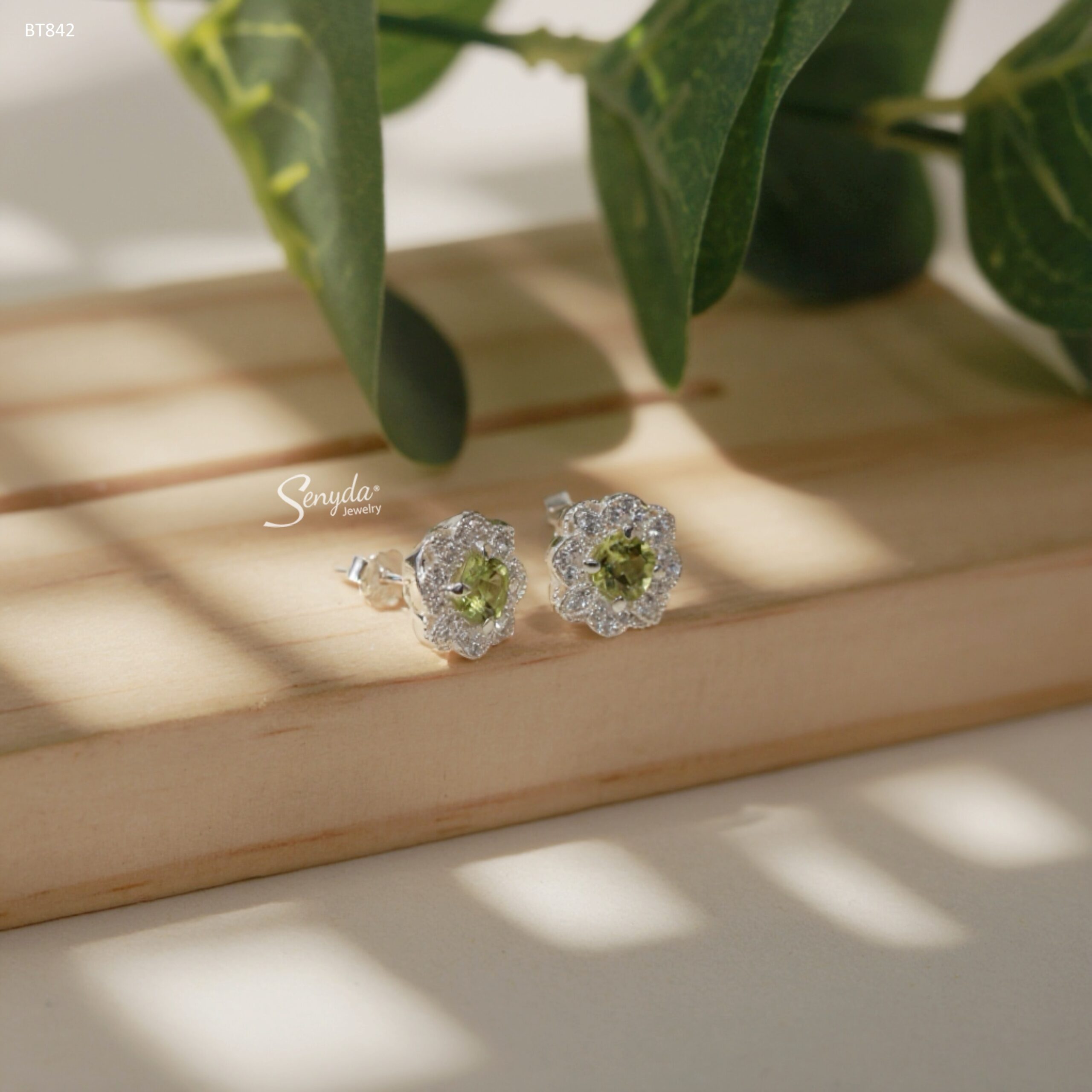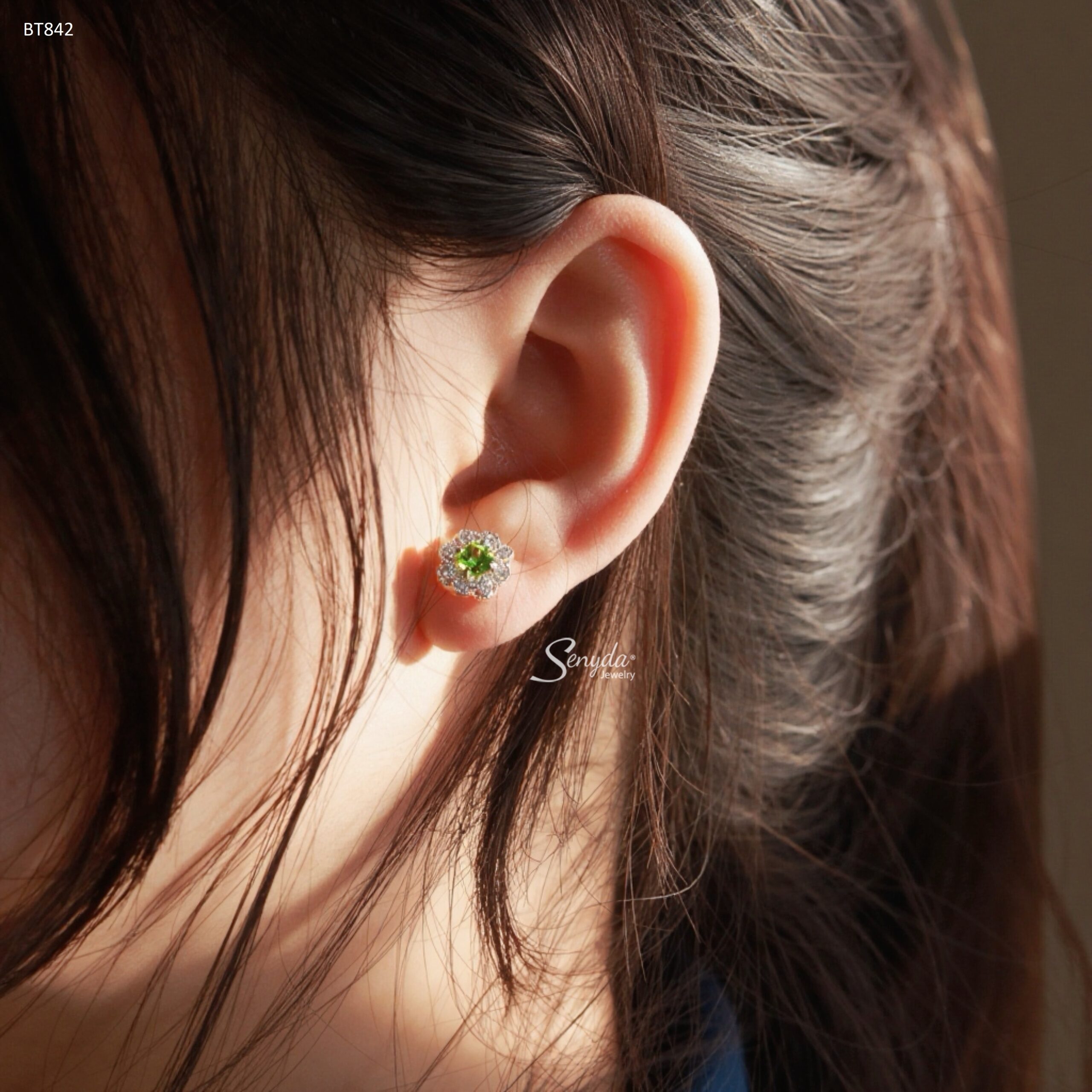 Mô tả: BT842 Bông tai bạc Ý Senyda mặt đá Peridot viền tròn hoa văn