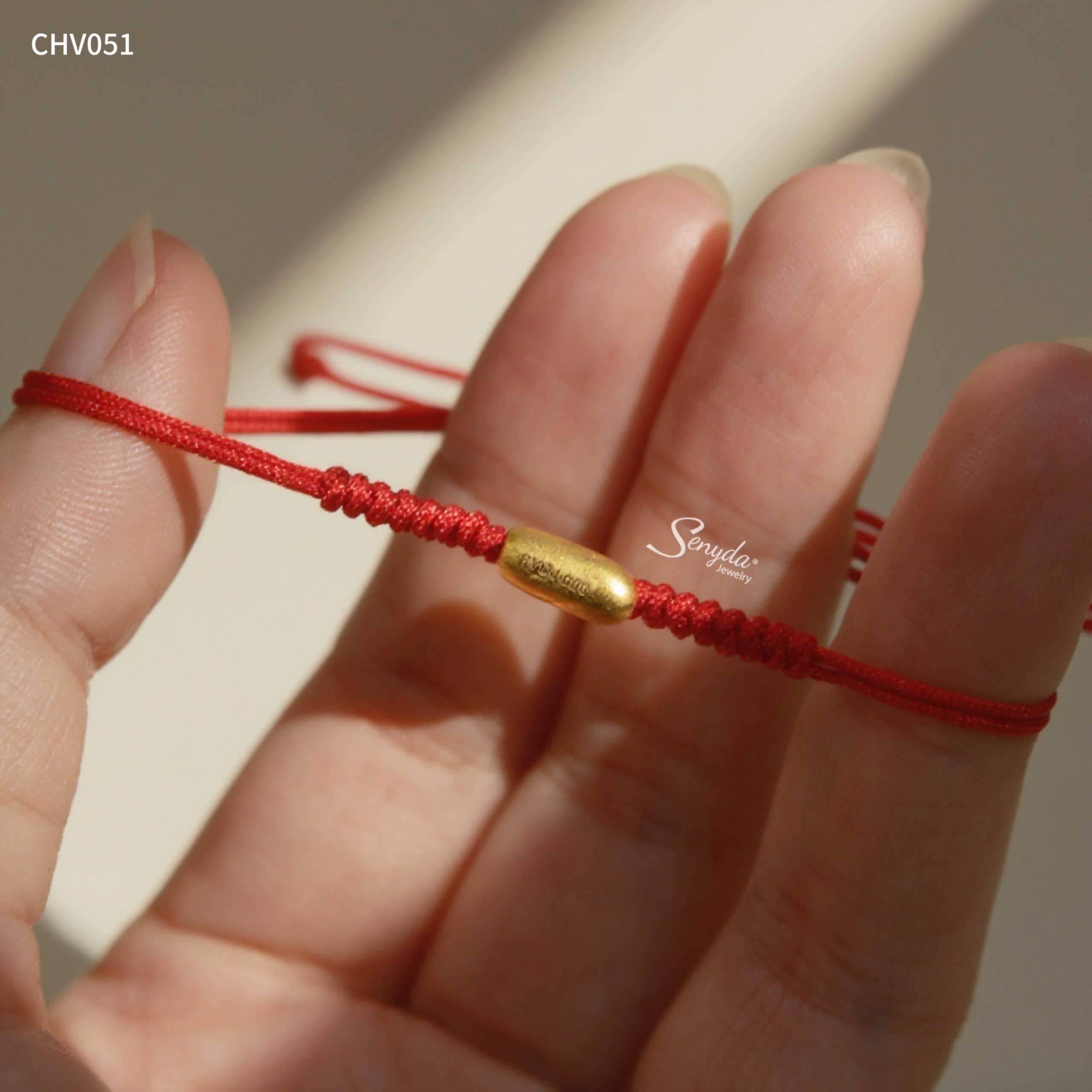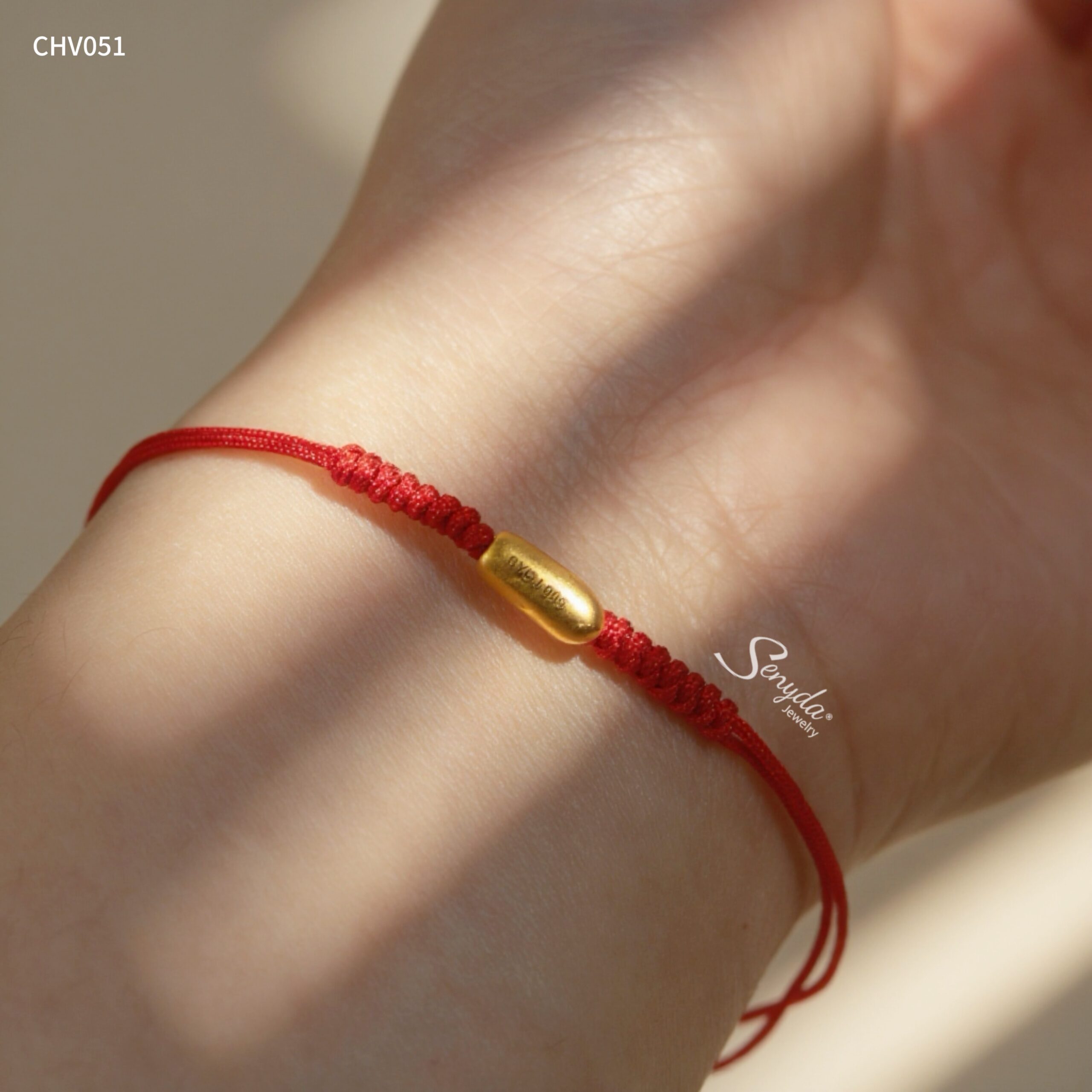 Hãy là người đầu tiên nhận xét “CHV051 Vòng tay chỉ đỏ charm vàng Senyda hạt gạo xỏ”