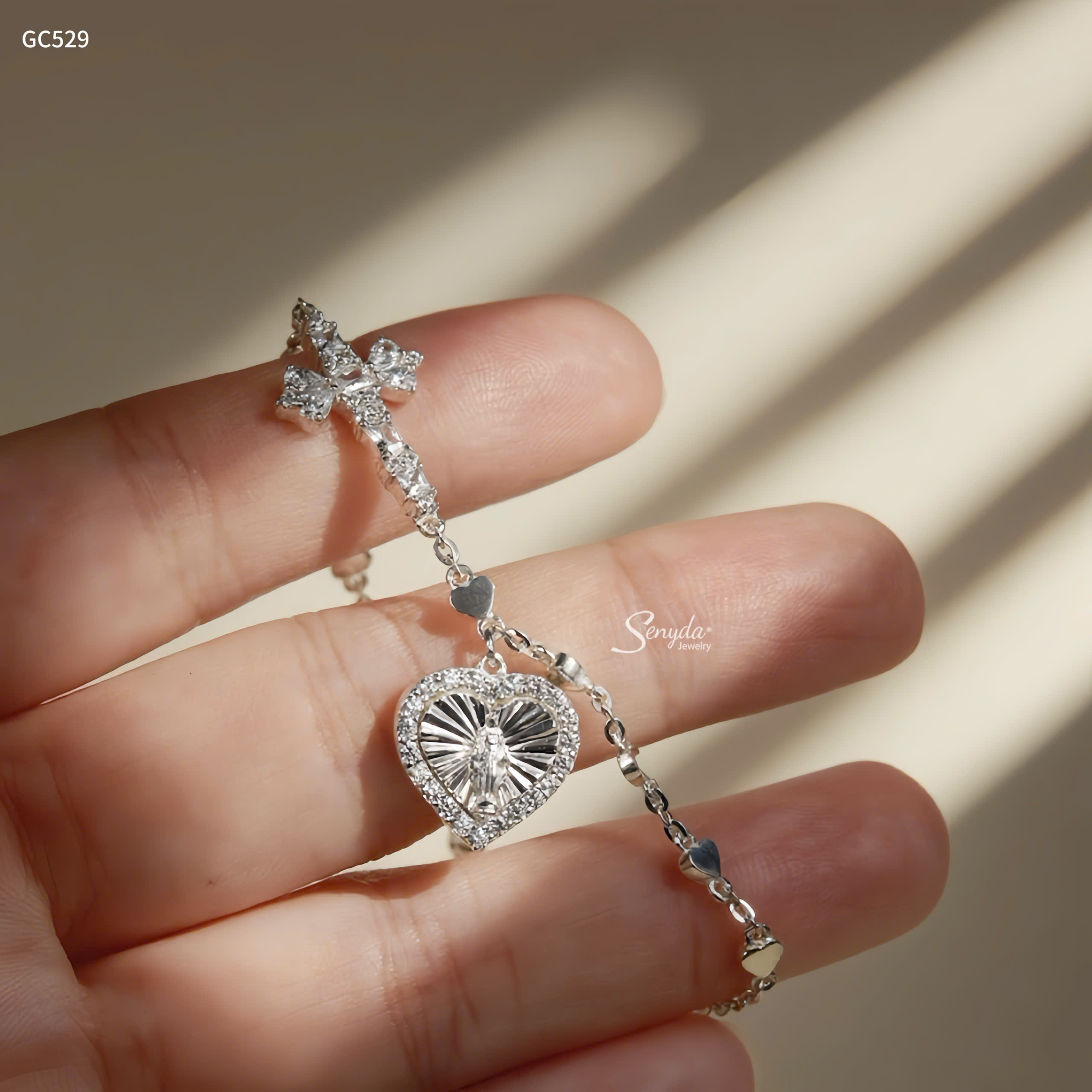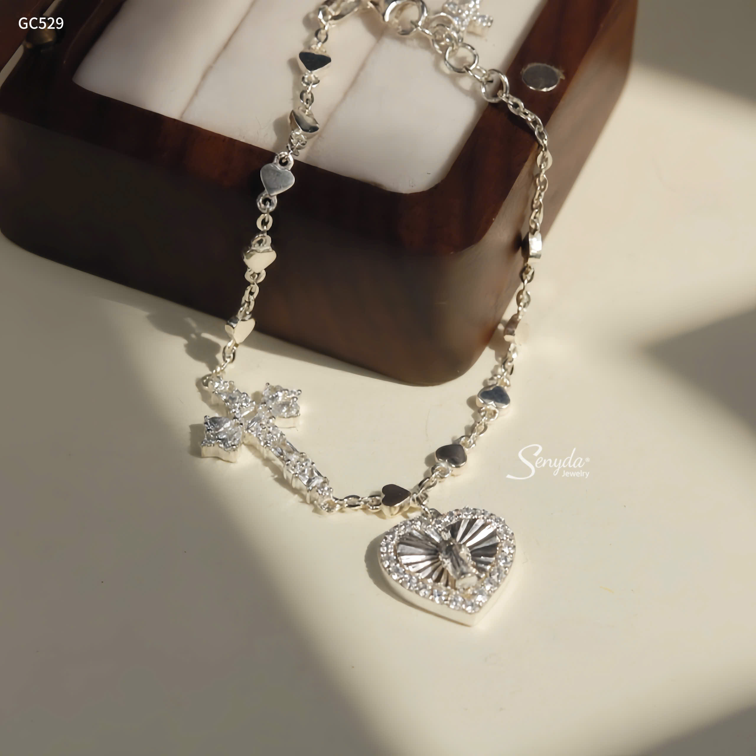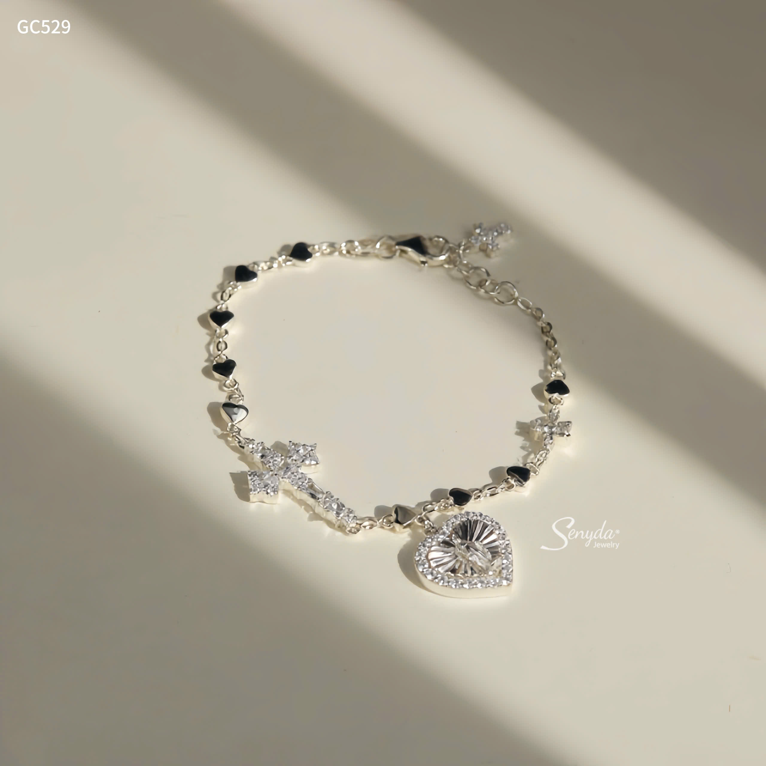 Mô tả: GC529 Lắc tay bạc Ý Senyda dây chữ cong xem tim mặt thánh giá đá treo charm tim