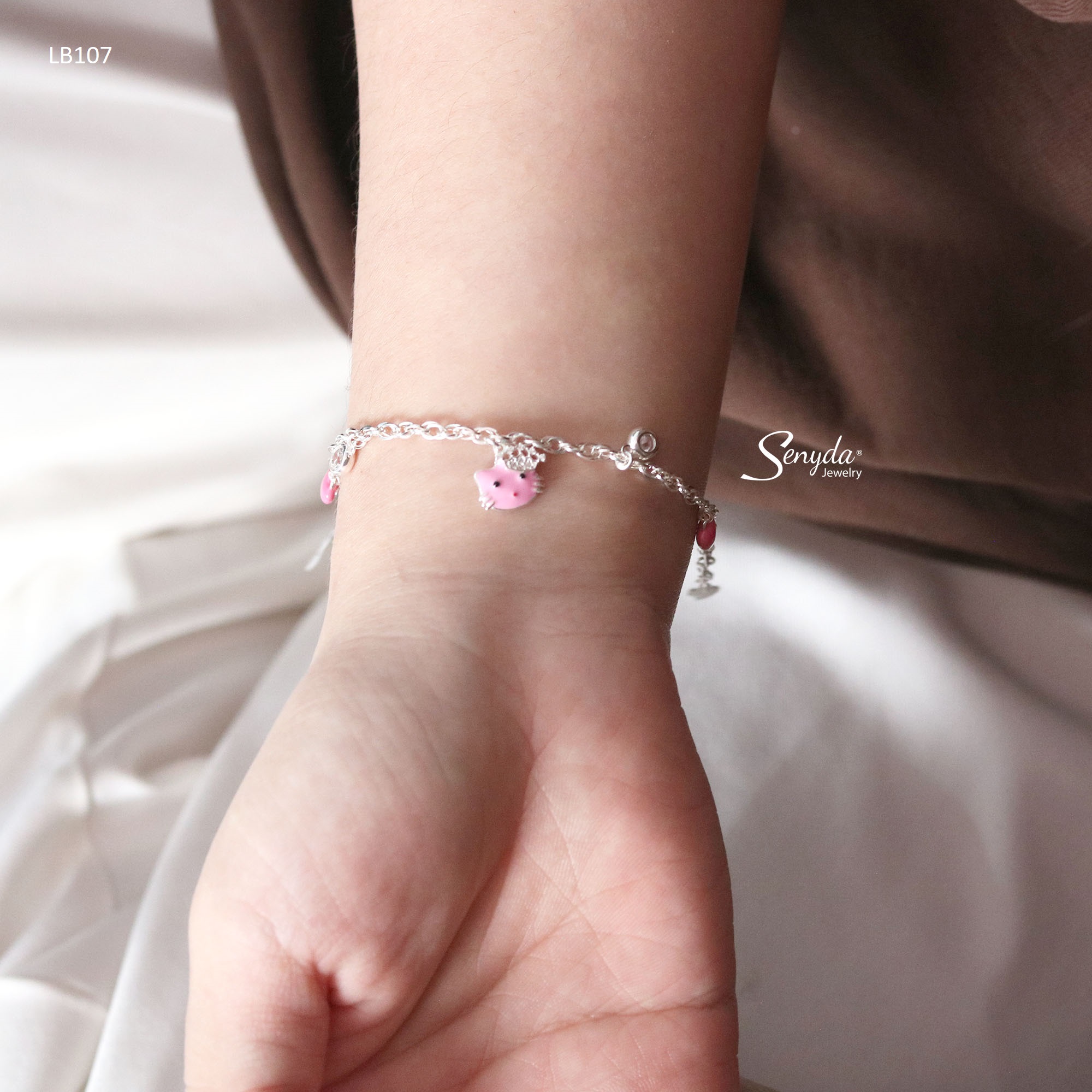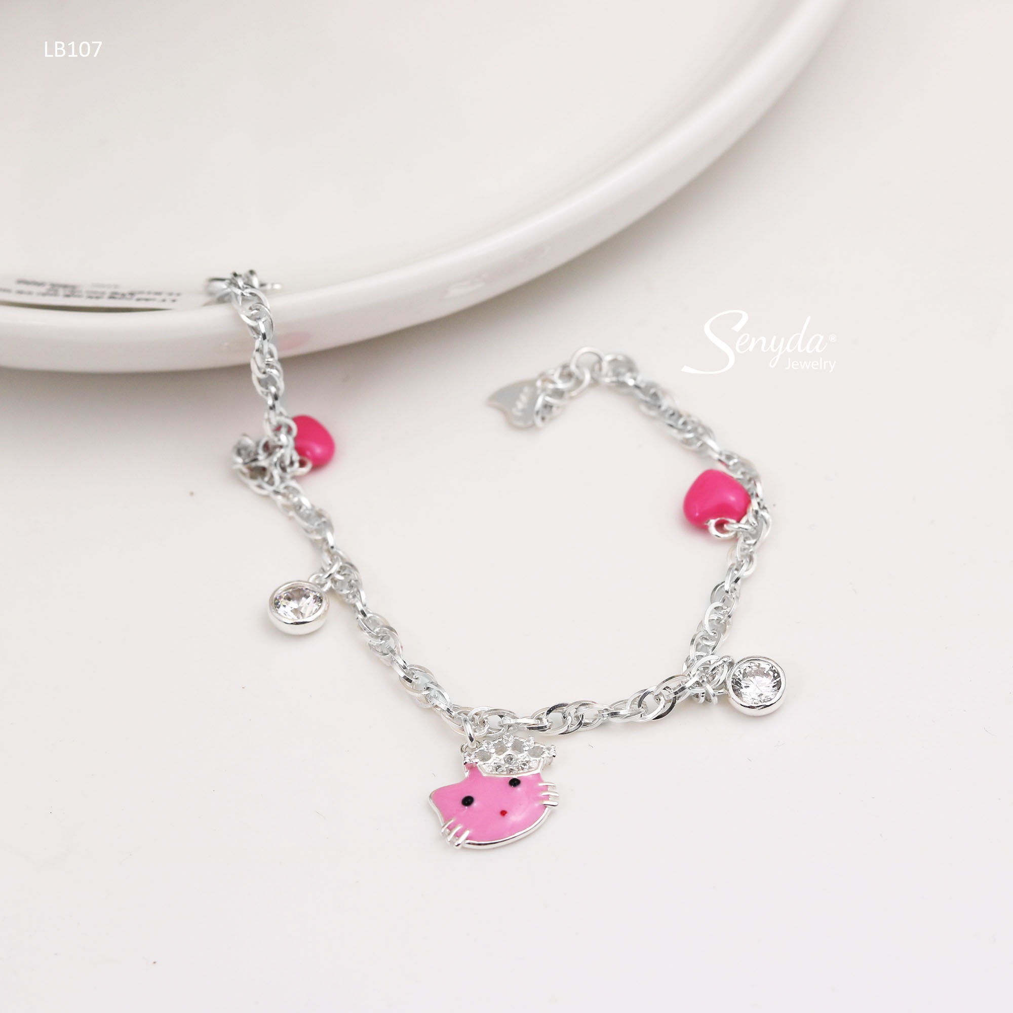 Mô tả: LB107 Lắc bạc cho bé Senyda dây chữ cong đôi mặt mèo trái tim hồng treo