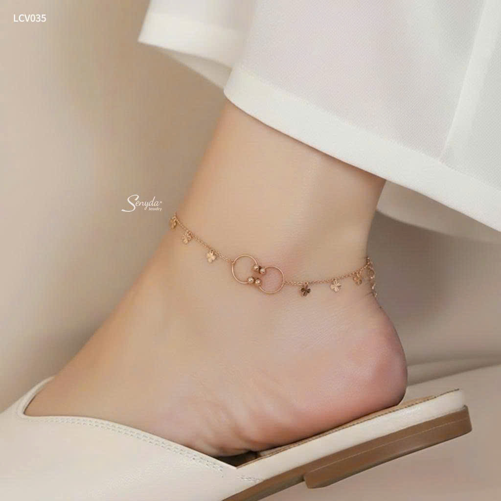 LCV035 Lắc chân vàng Senyda 2 vòng tròn hở 2 đầu bi hoa 4 cánh giác treo
