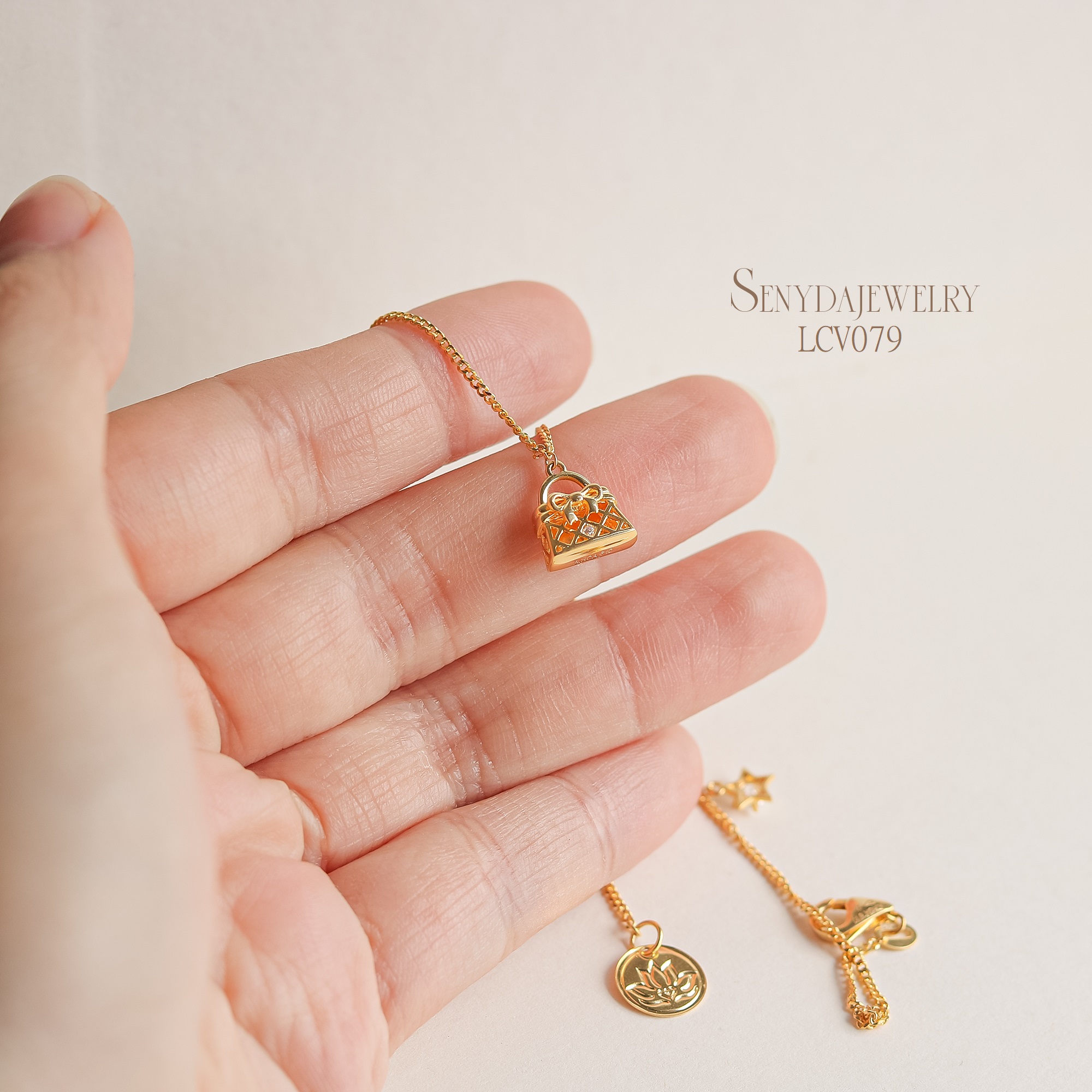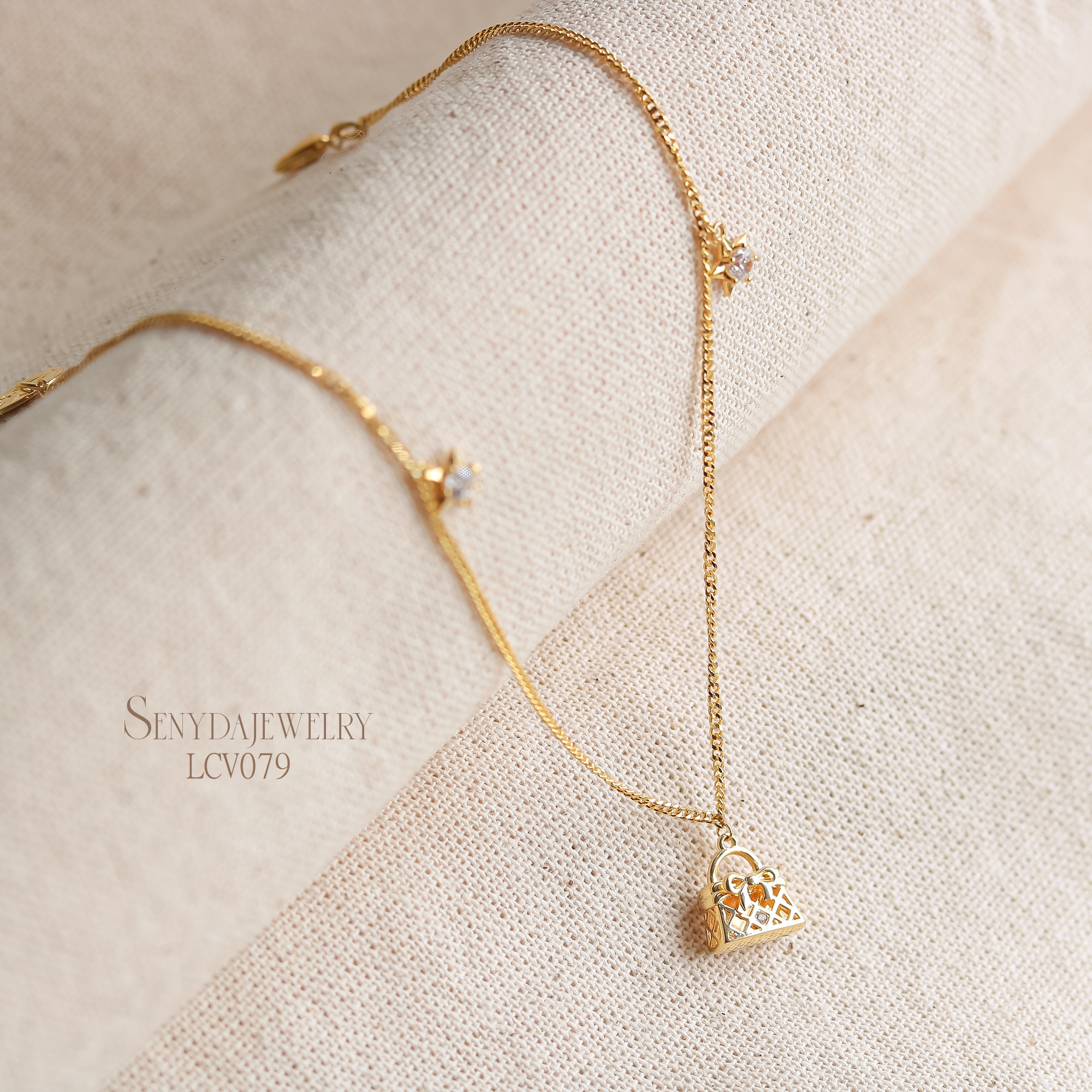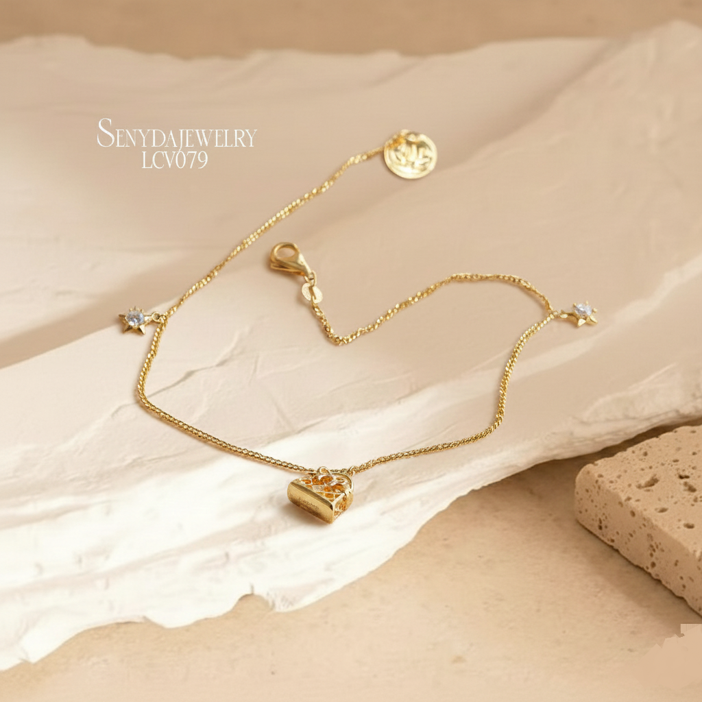 Hãy là người đầu tiên nhận xét “LCV079 Lắc chân vàng Senyda dây khoen lật túi xách ngôi sao treo”
