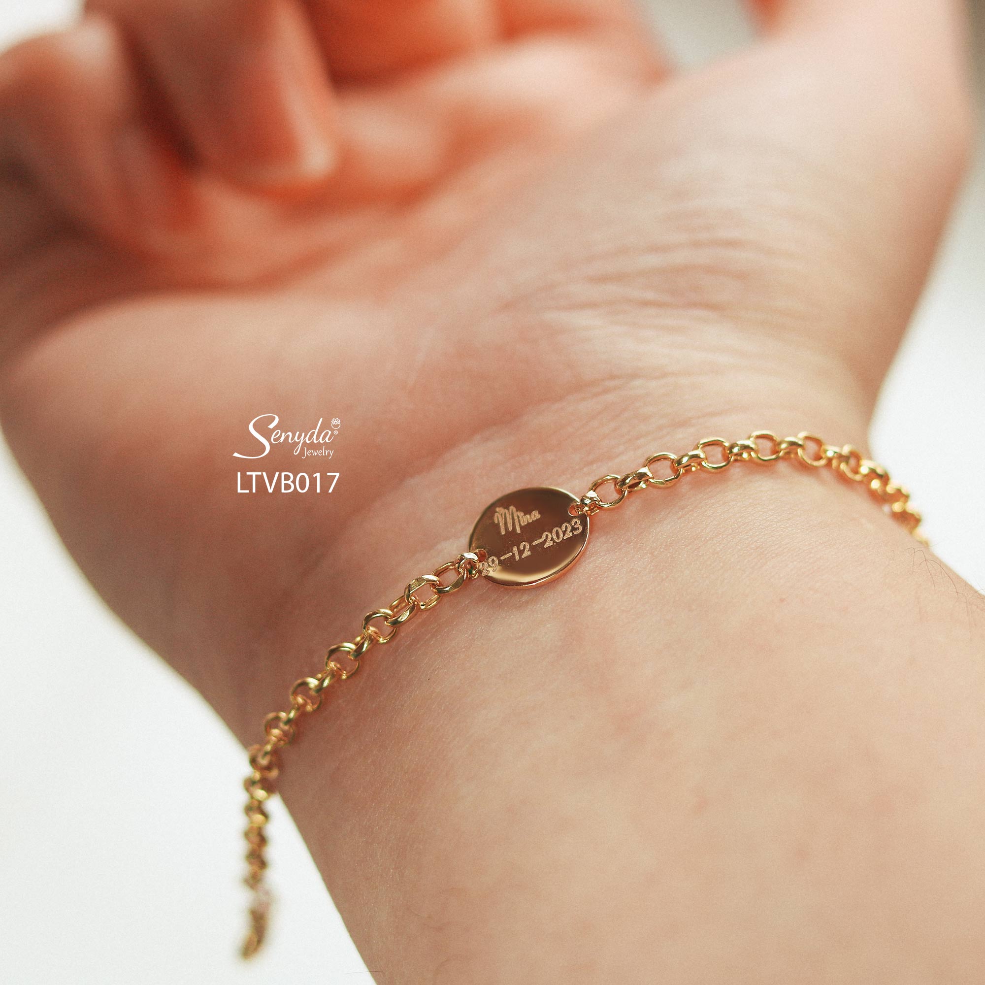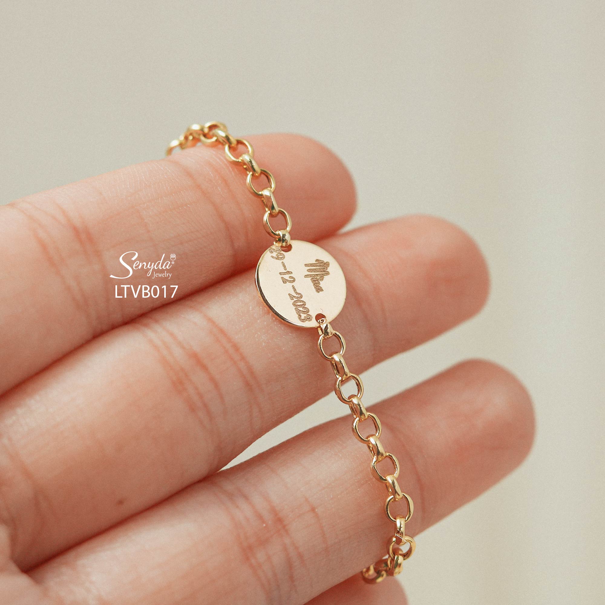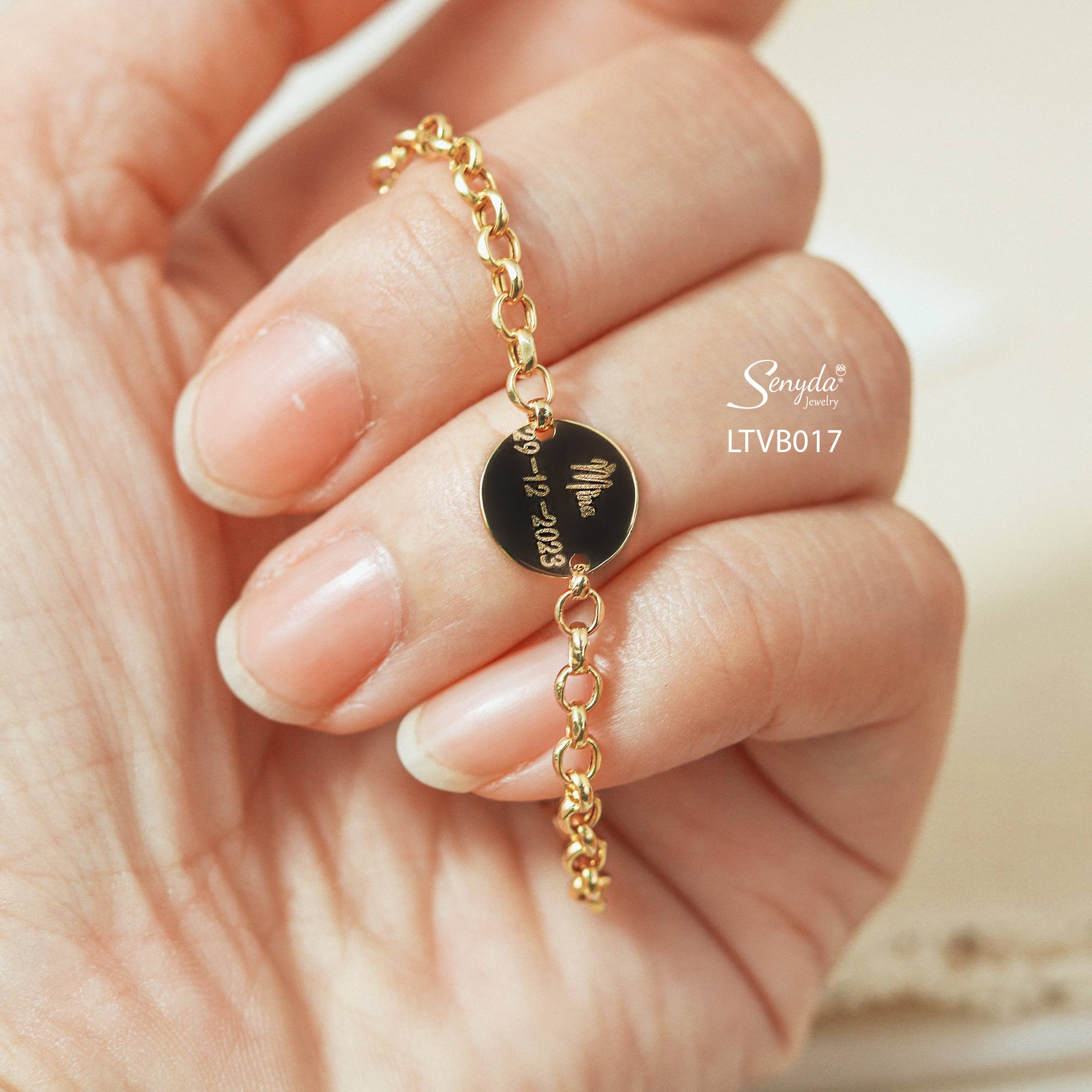 Mô tả: LTVB017 Lắc tay vàng bé Senyda chữ cong tròn mặt tròn khắc chữ