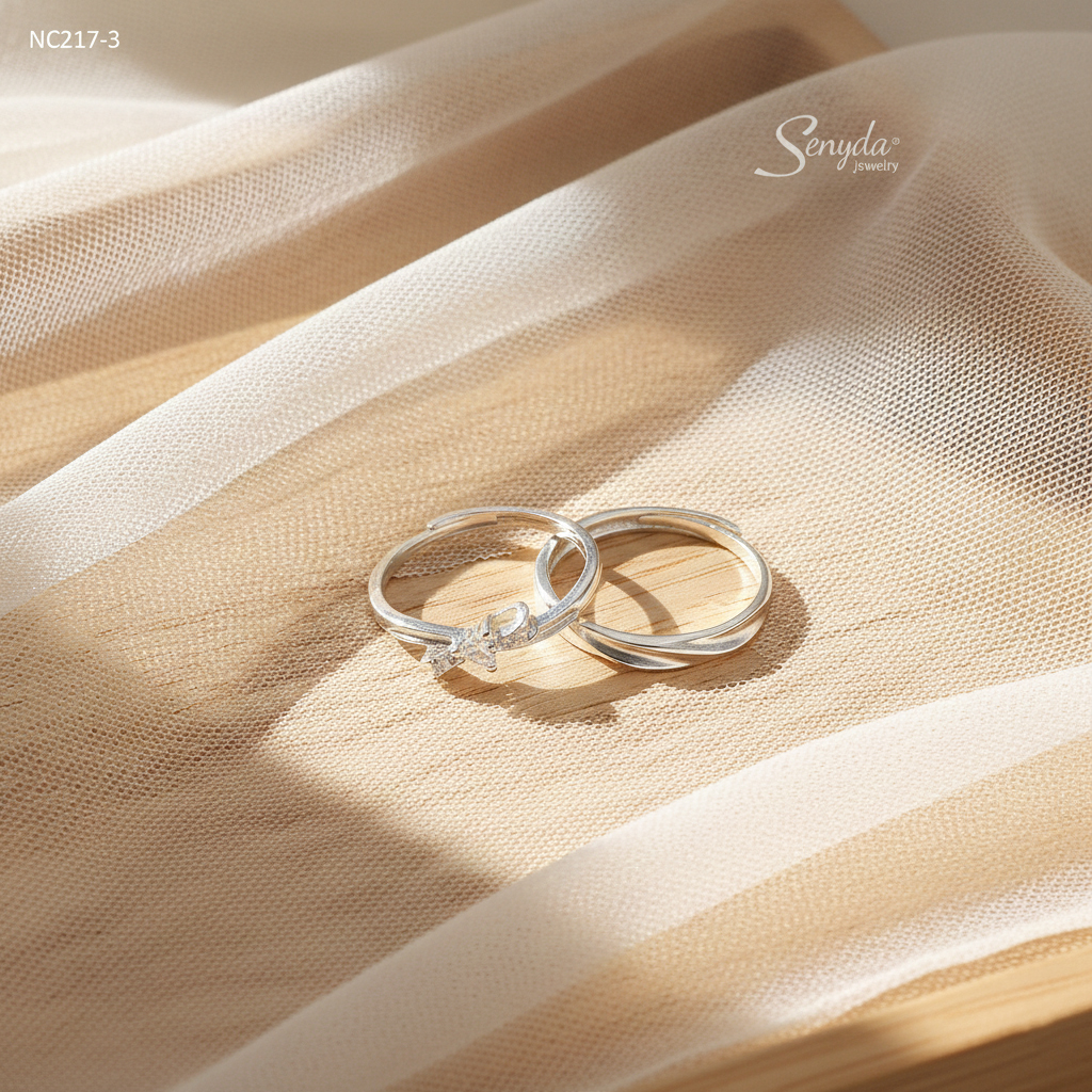 Mô tả: NC217 Nhẫn đôi bạc Ý Senyda nam xoắn trơn nữ hột tim đai nơ đá