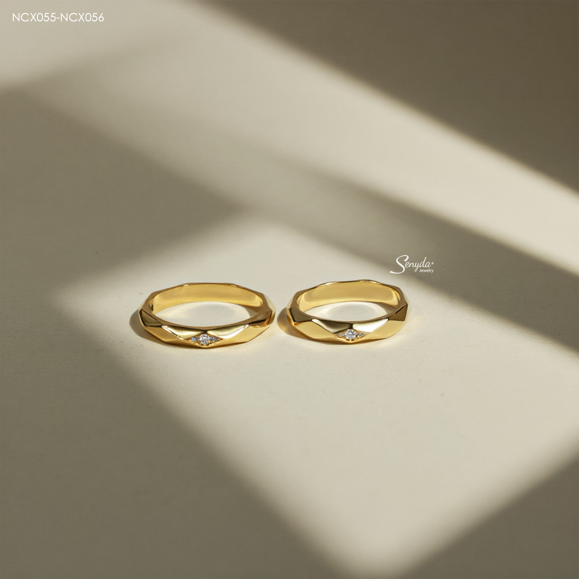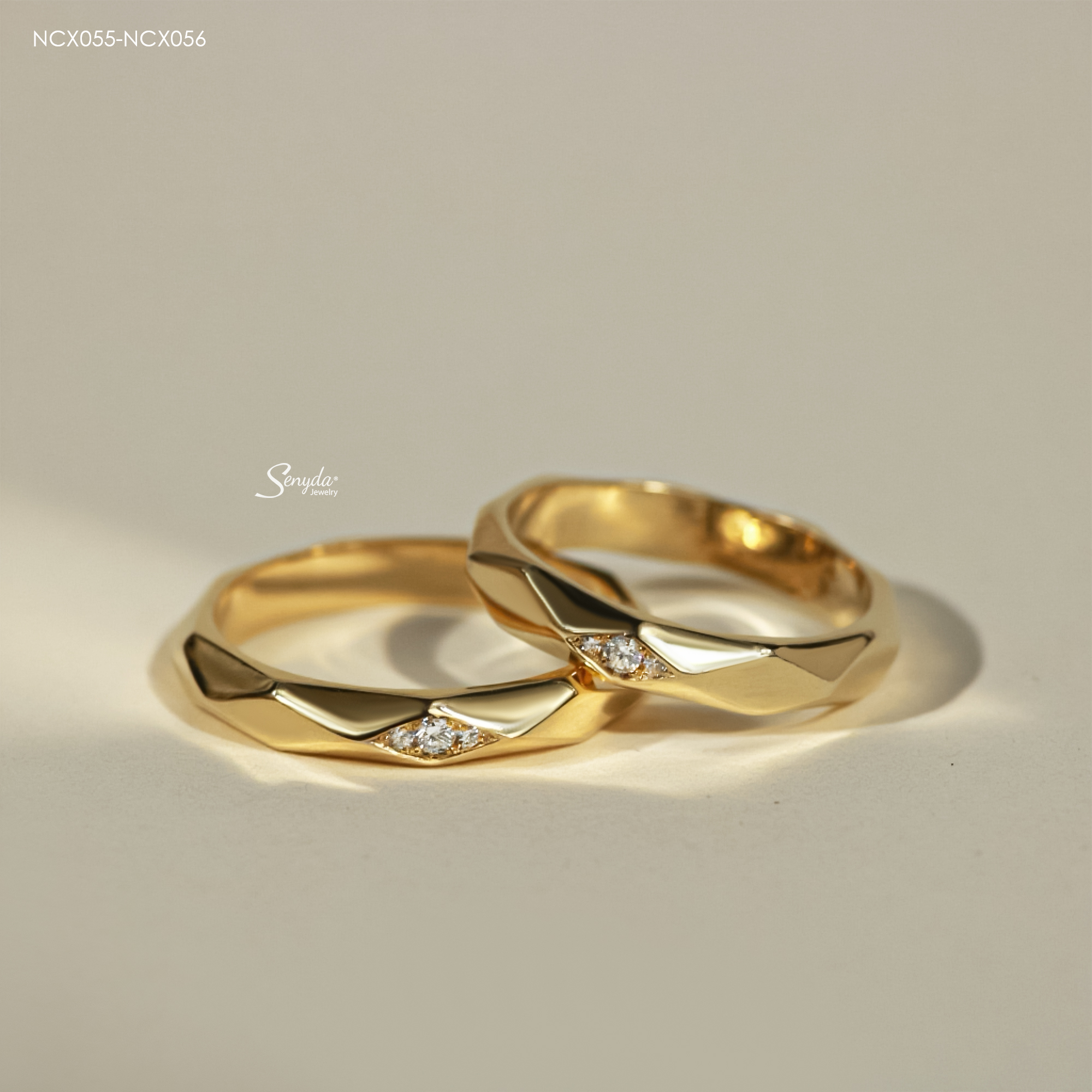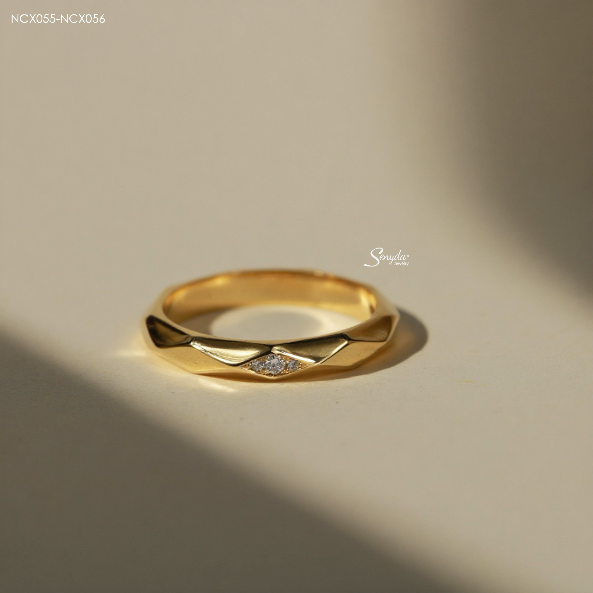 Mô tả: NCX055-NCX056 Nhẫn cưới kim cương Senyda bản trơn hình thoi 3 nụ đá nhỏ