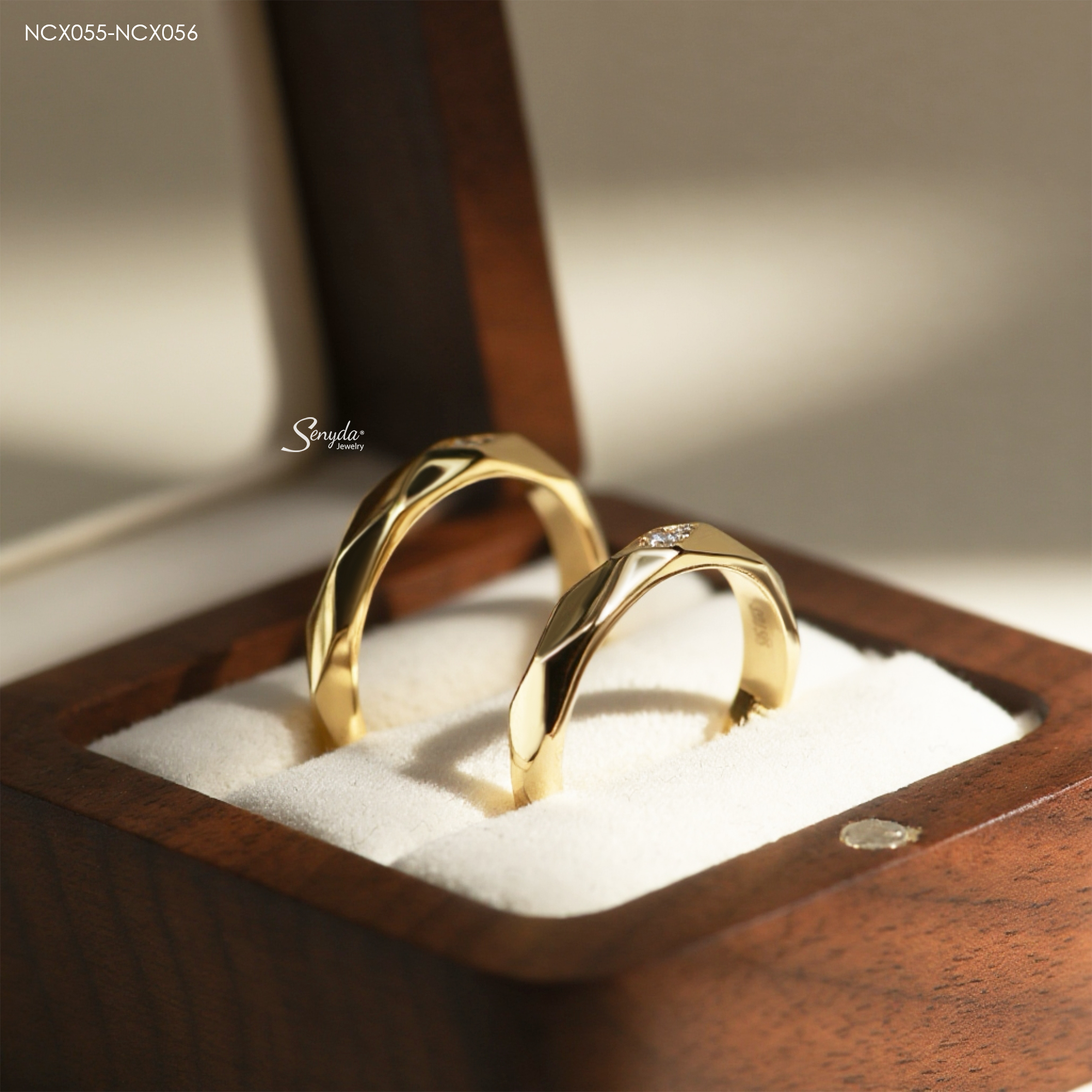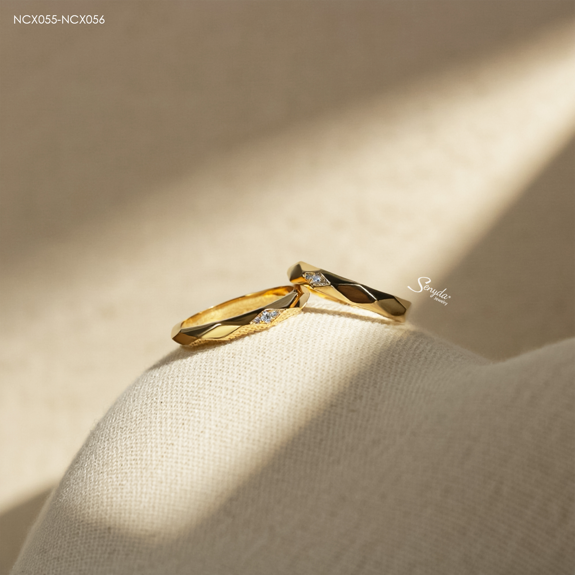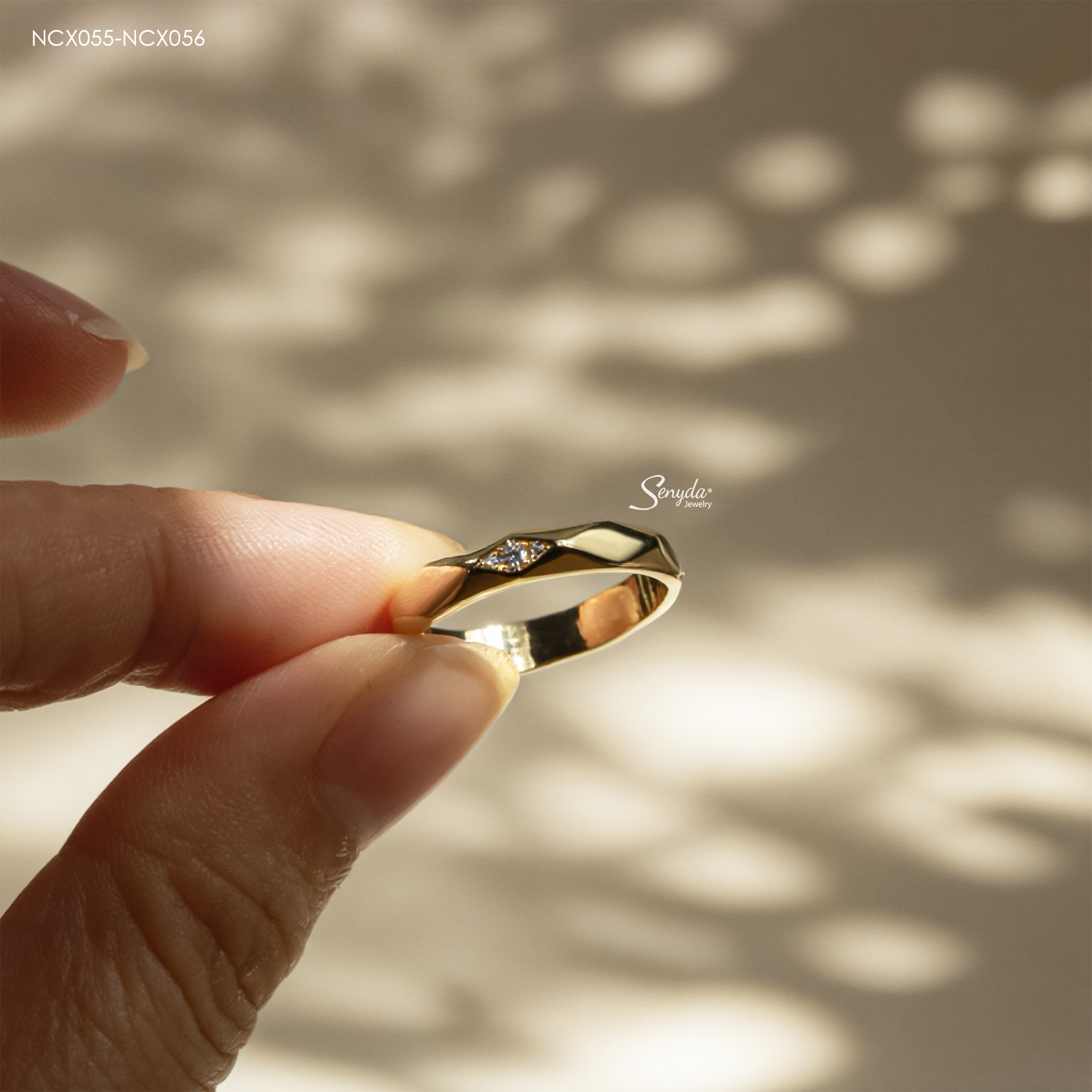 Mô tả: NCX055-NCX056 Nhẫn cưới kim cương Senyda bản trơn hình thoi 3 nụ đá nhỏ