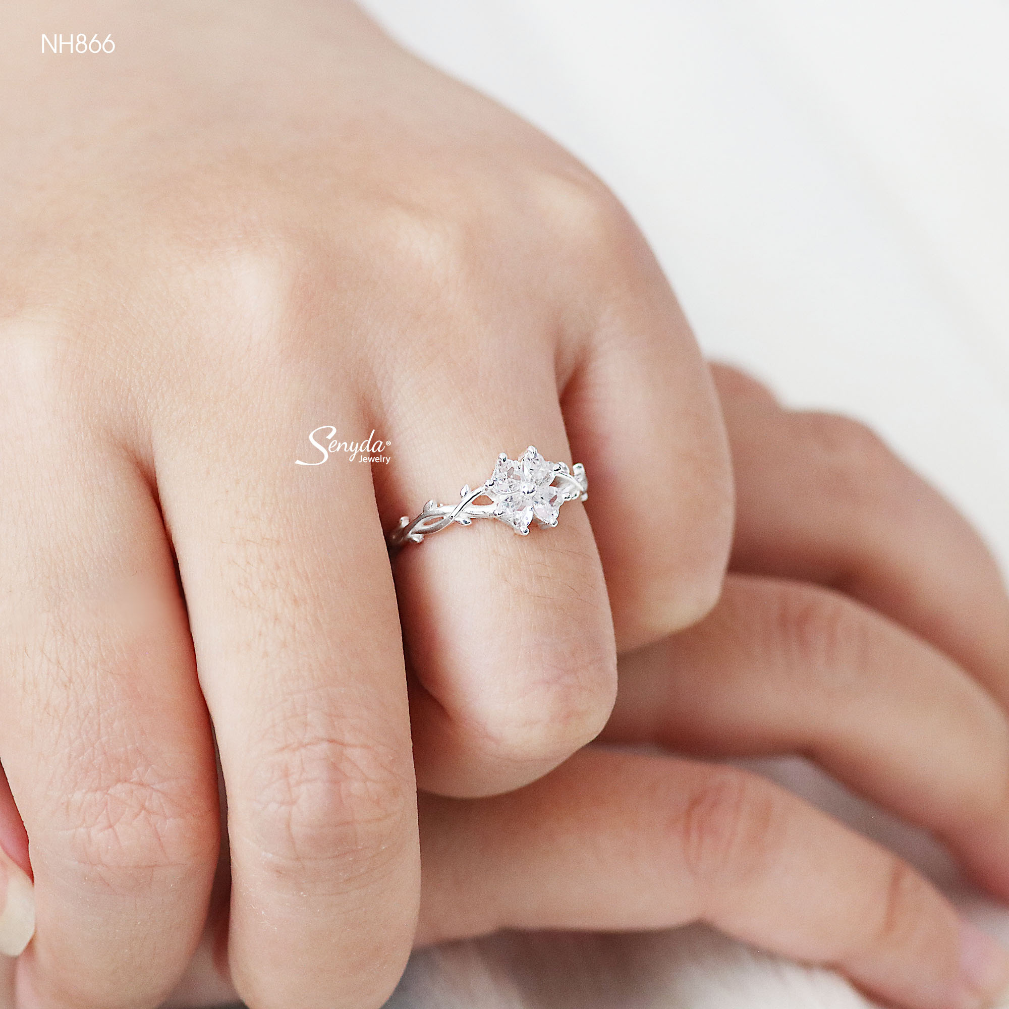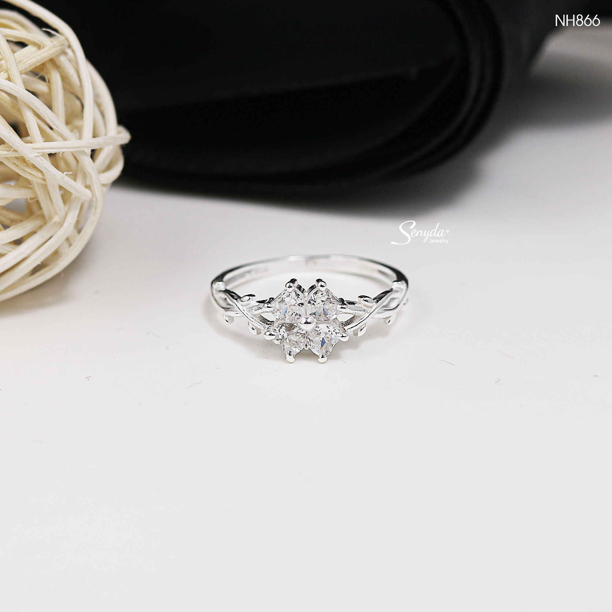Mô tả: NH866 Nhẫn bạc Ý Senyda cỏ 4 lá đá tim đai dây quấn