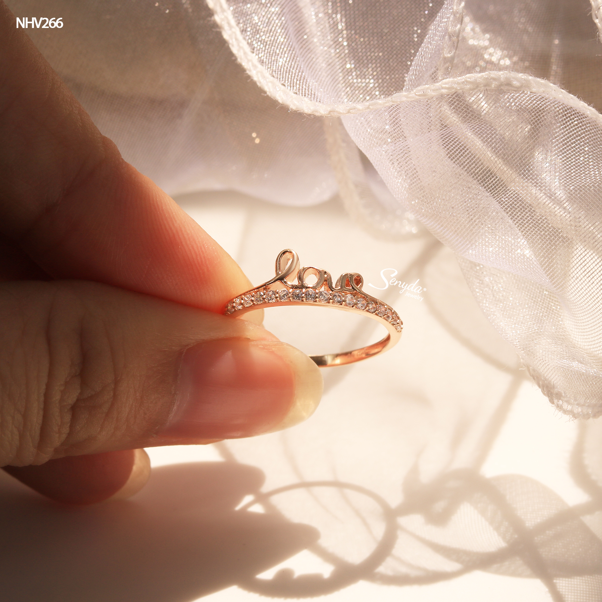 Mô tả: NHV266 Nhẫn vàng Senyda chữ Love nửa hàng đá