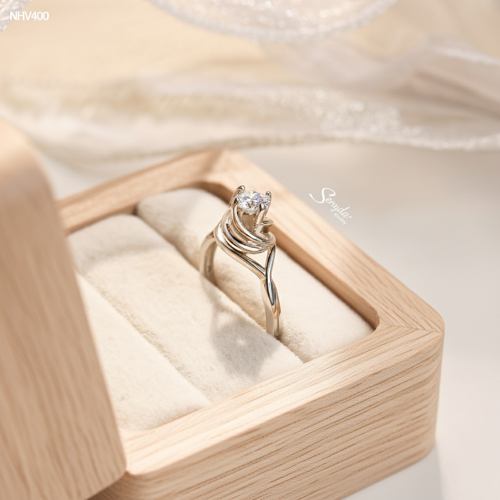 Mô tả: NHV400 Nhẫn vàng Senyda 1 hột đế hoa hồng xoáy trơn
