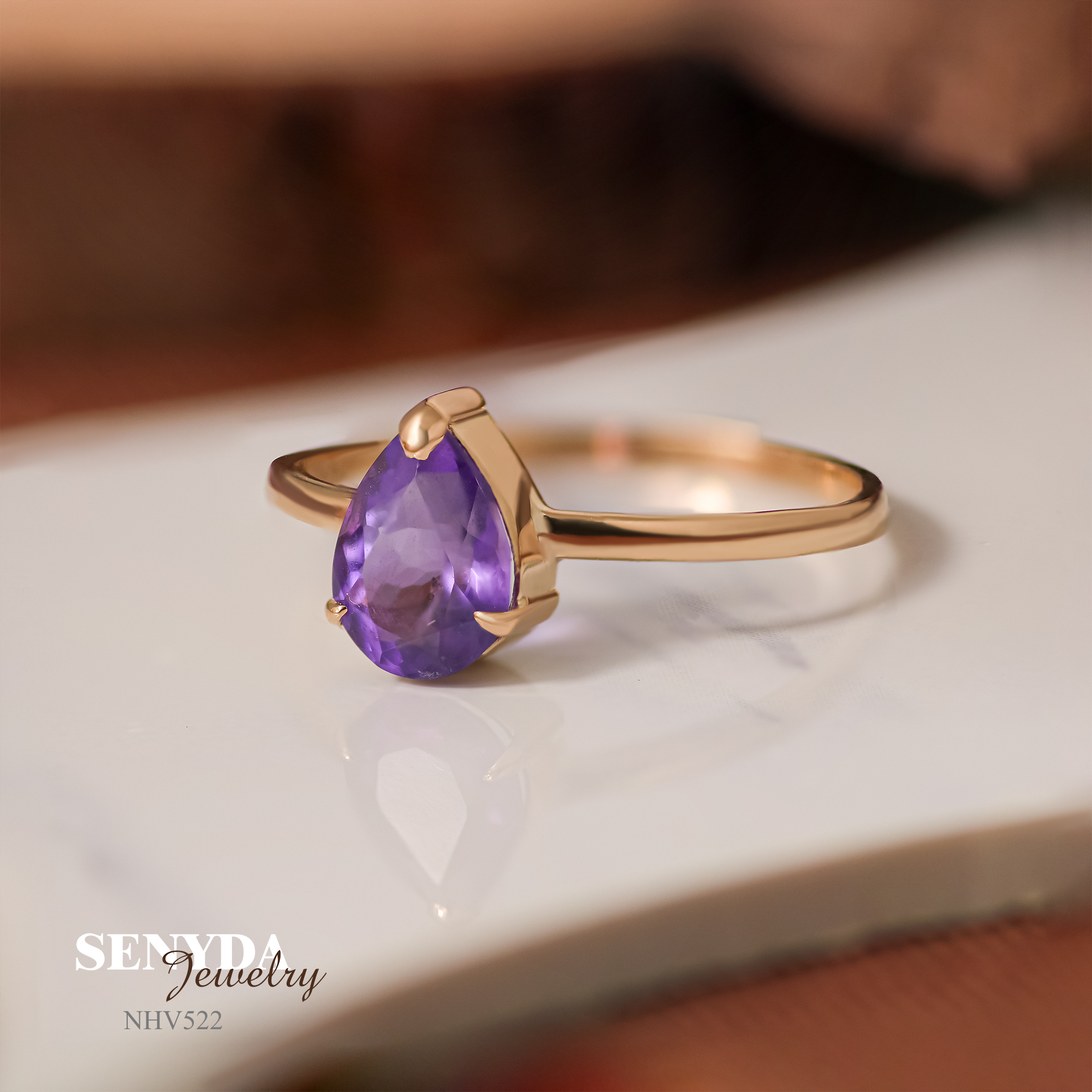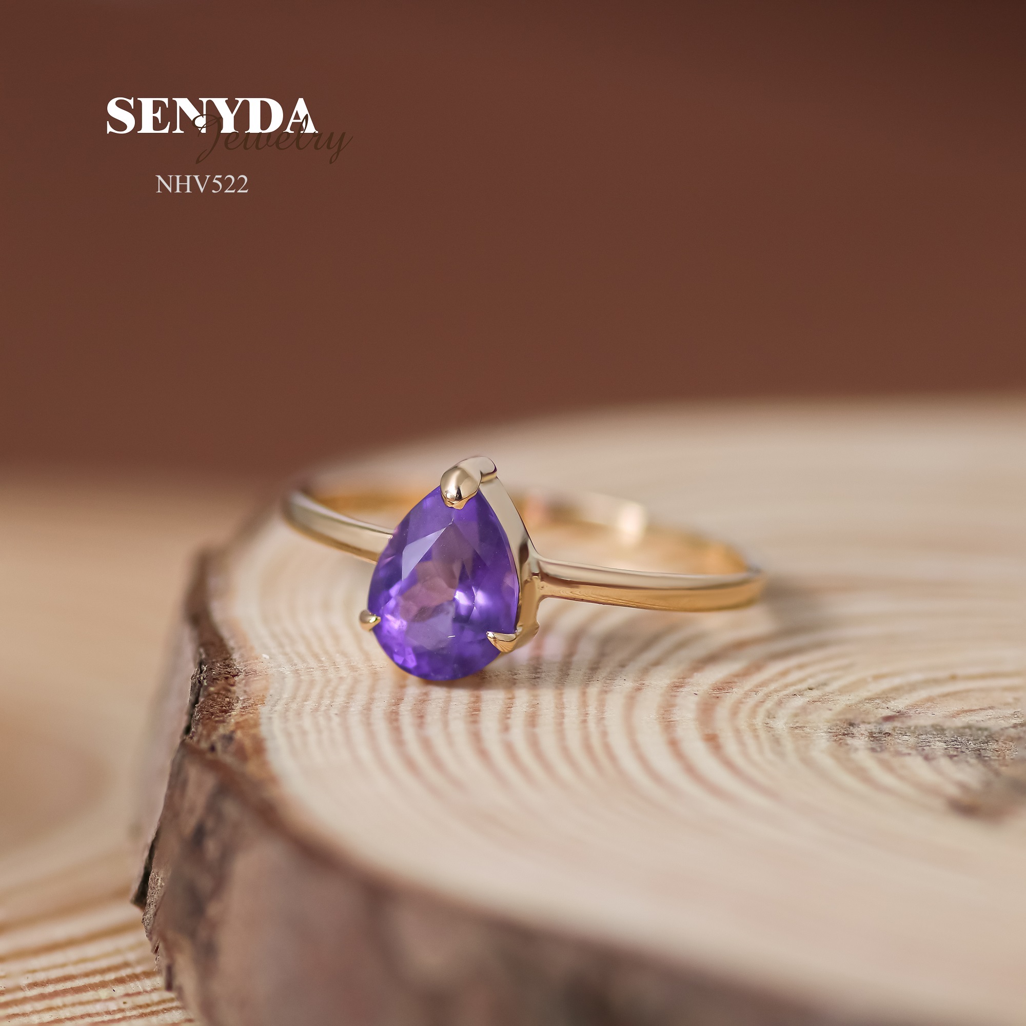 Hãy là người đầu tiên nhận xét “NHV522 Nhẫn vàng Senyda mặt đá Amethyst giọt nước đai trơn”