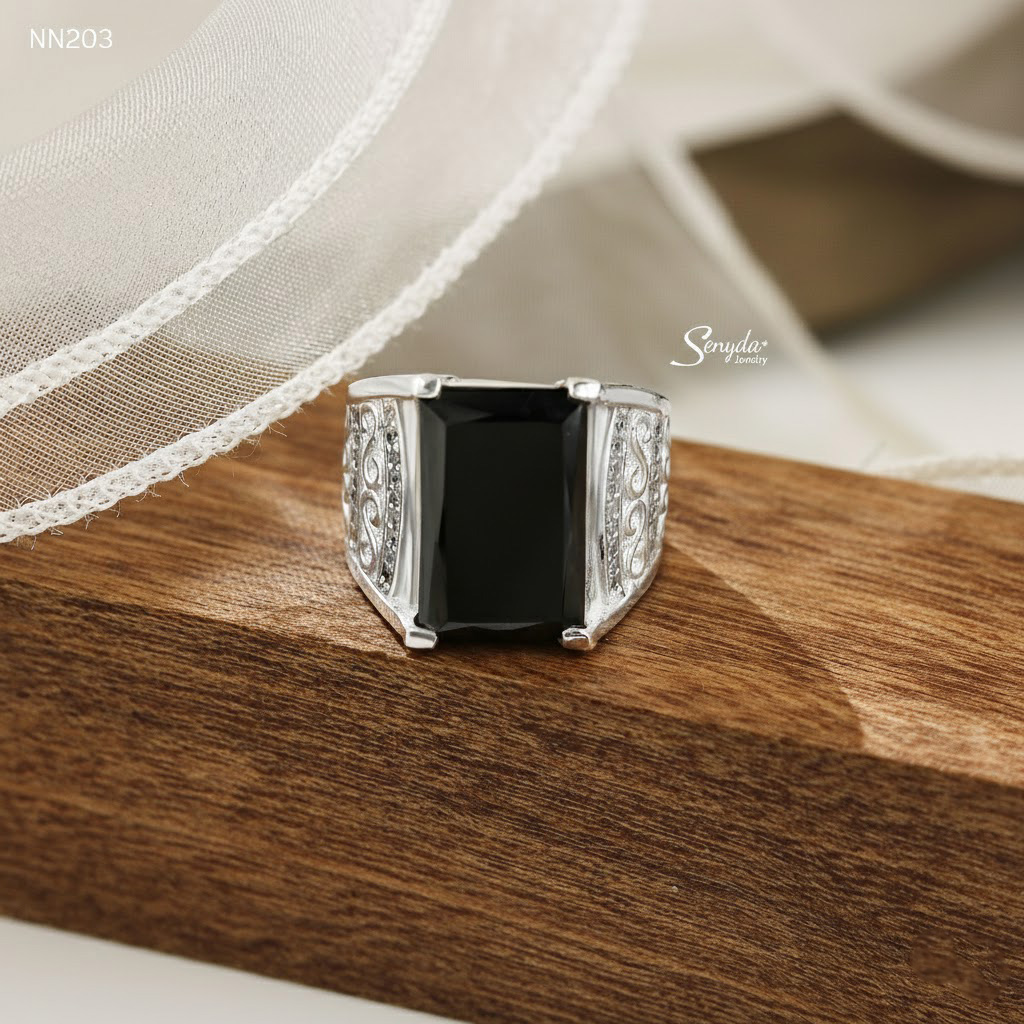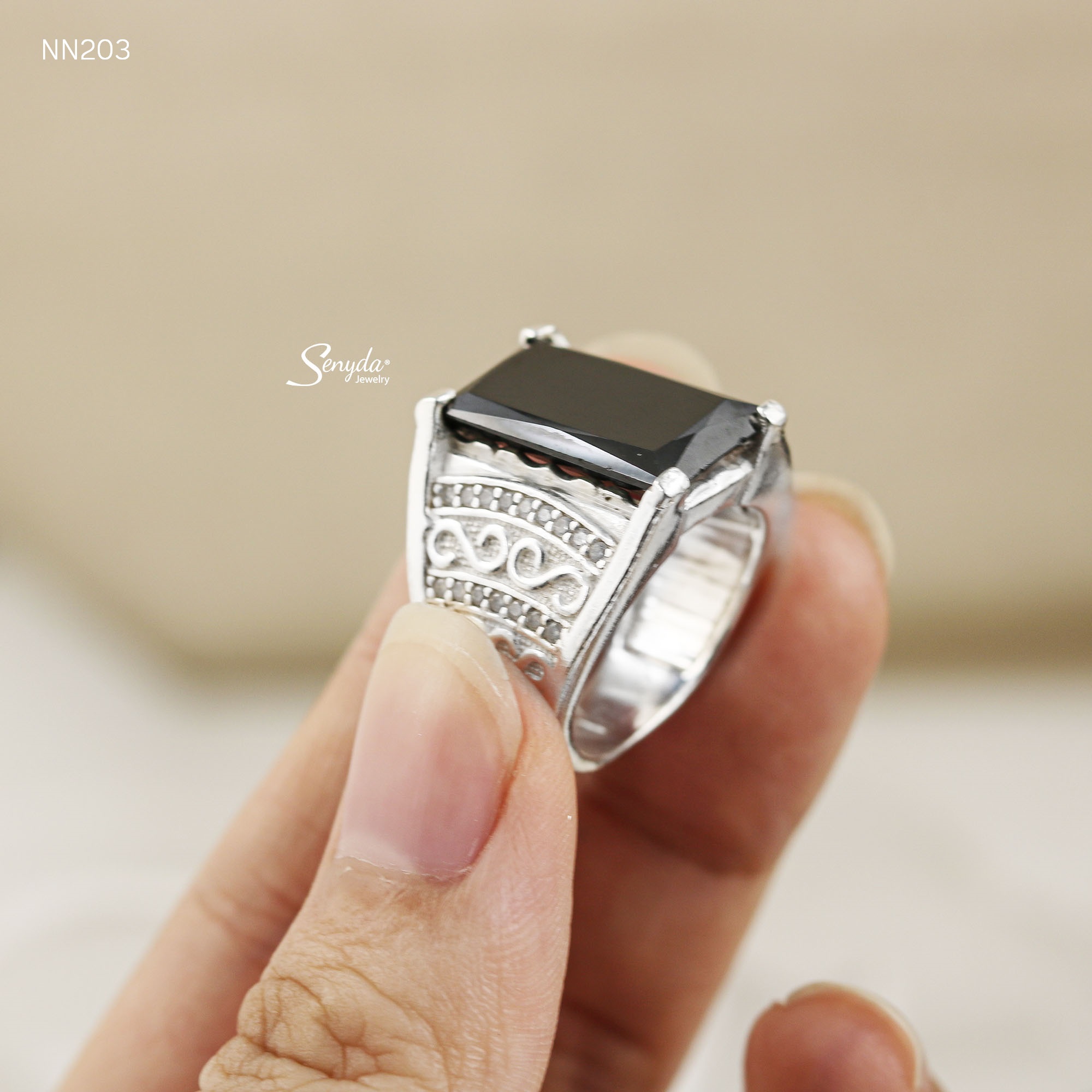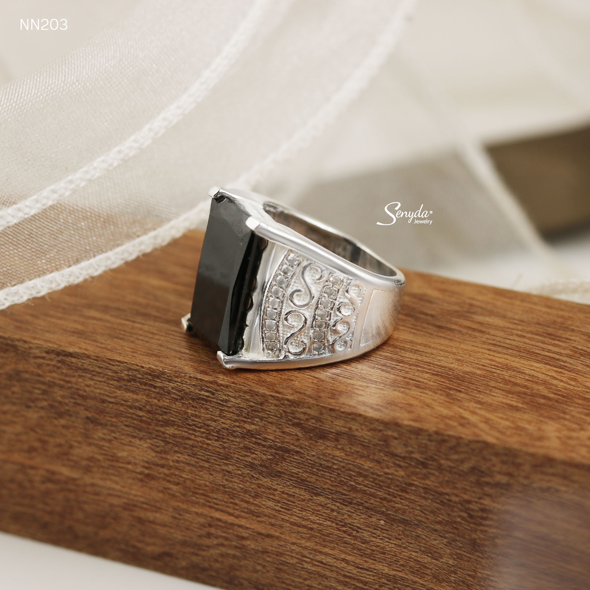 Mô tả: NN203 Nhẫn bạc nam Senyda đá chữ nhật lớn đen đai 2 bên hoa văn 2 dãy đá