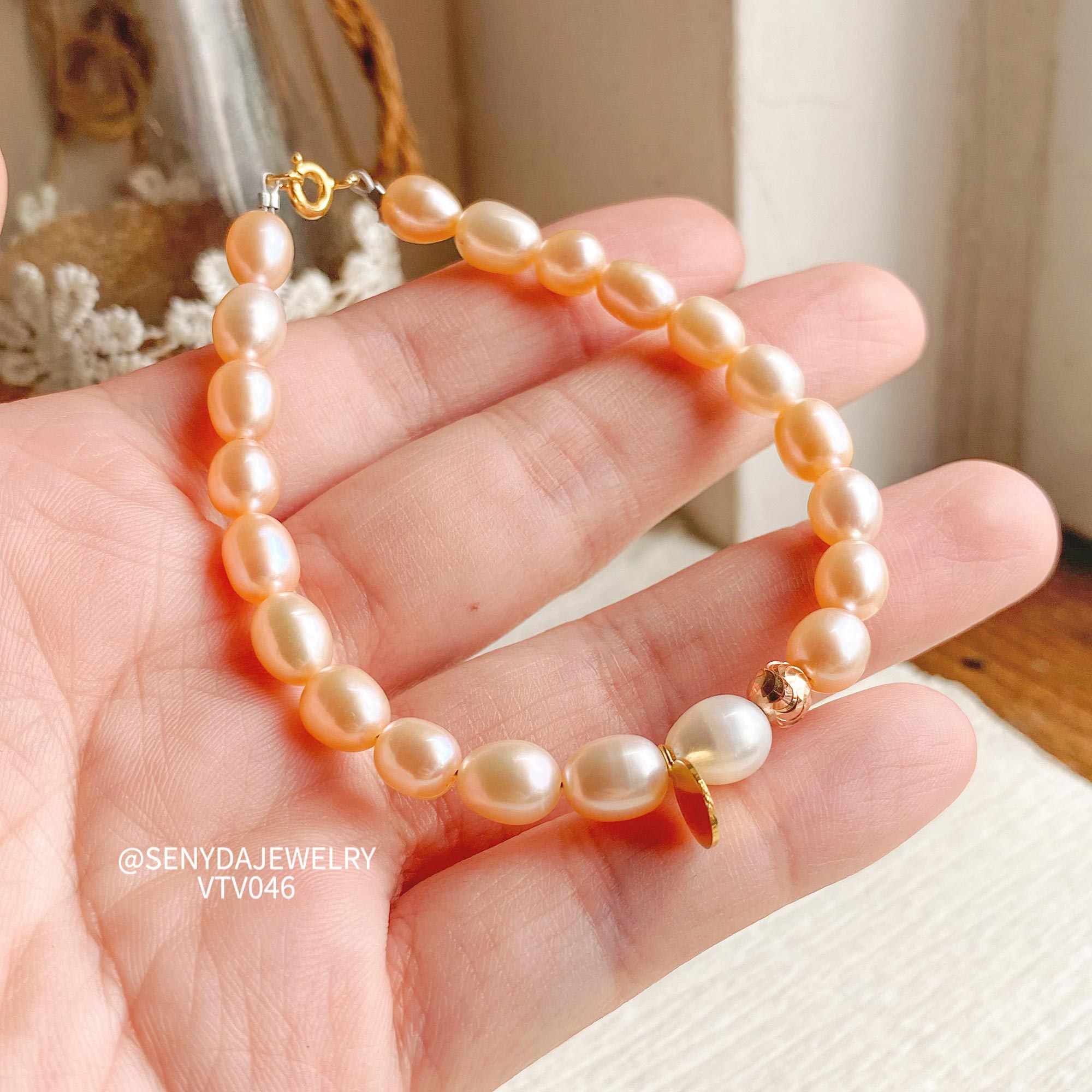 VTV046 Vòng tay vàng Senyda mềm Ngọc trai nước ngọt bi giác thẻ tròn treo